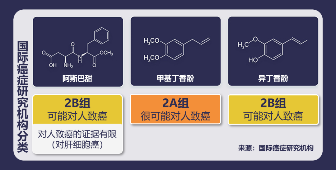 國際癌癥研究機構(gòu)根據(jù)人類癌癥(特別是肝細胞癌這種肝癌)方面的有限證據(jù),將阿斯巴甜歸類為可能對人類致癌(第2B組)。在實驗動物中發(fā)現(xiàn)的致癌證據(jù)也有限,與導致癌癥的可能機理有關(guān)的證據(jù)同樣有限。