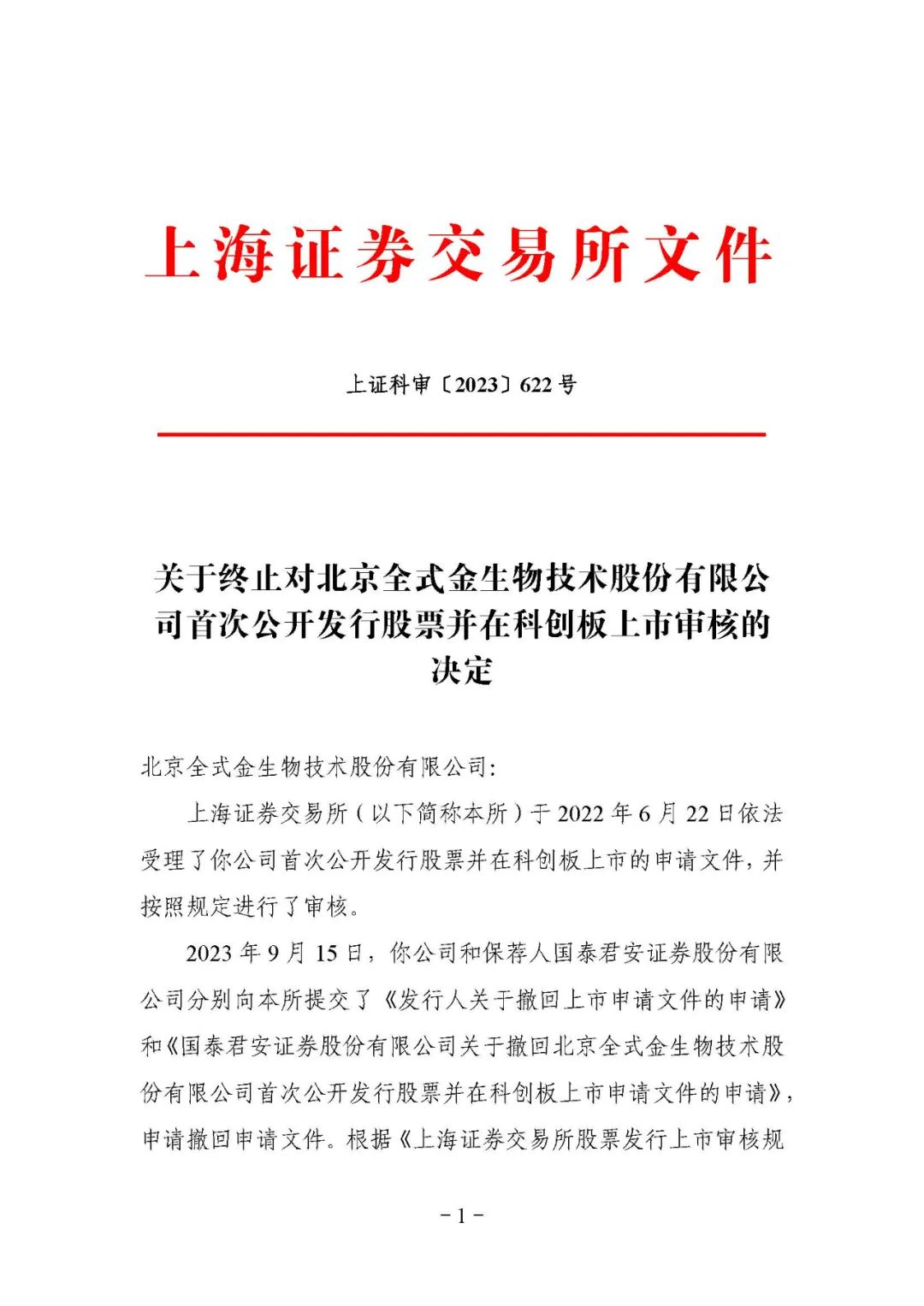 10月17日,上交所公布對北京全式金生物技術(shù)股份有限公司科創(chuàng)板IPO終止審核的決定,直接原因是公司及保薦機構(gòu)國泰君安撤回申報/保薦。公司申報IPO于2022年6月22日獲得受理,只公布了一版招股書,完成了首輪問詢回復。