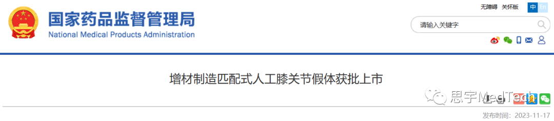 2023年11月17日,國家藥監(jiān)局更新了納通生物科技(北京)有限公司的增材制造匹配式人工膝關節(jié)假體產品獲批消息。原文如下:
