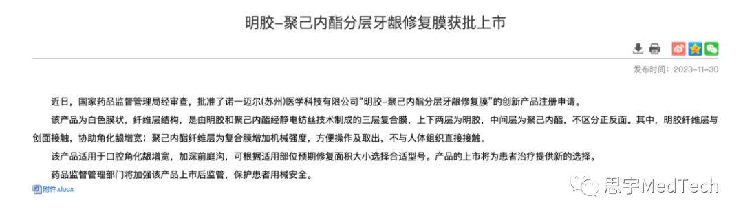 “近日,國家藥品監(jiān)督管理局經(jīng)審查,批準(zhǔn)了諾一邁爾(蘇州)醫(yī)學(xué)科技有限公司“明膠-聚己內(nèi)酯分層牙齦修復(fù)膜”的創(chuàng)新產(chǎn)品注冊申請。
