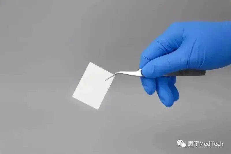 該產(chǎn)品為白色膜狀,纖維層結(jié)構(gòu),是由明膠和聚己內(nèi)酯經(jīng)靜電紡絲技術(shù)制成的三層復(fù)合膜,上下兩層為明膠,中間層為聚己內(nèi)酯,不區(qū)分正反面。其中,明膠纖維層與創(chuàng)面接觸,協(xié)助角化齦增寬;聚己內(nèi)酯纖維層為復(fù)合膜增加機械強度,方便操作及取出,不與人體組織直接接觸。