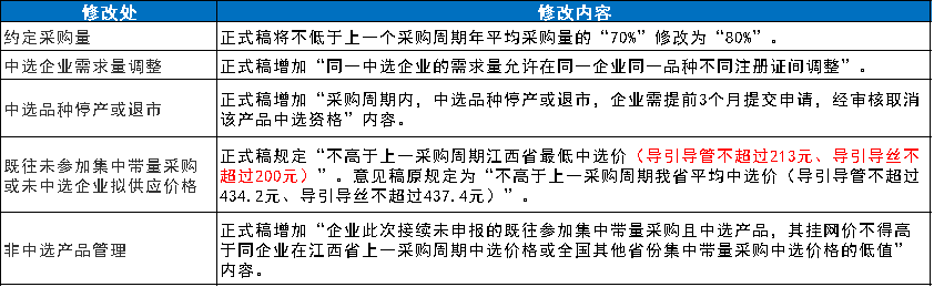 帶量方案正式稿與征求意見稿相比,主要修改內(nèi)容有: