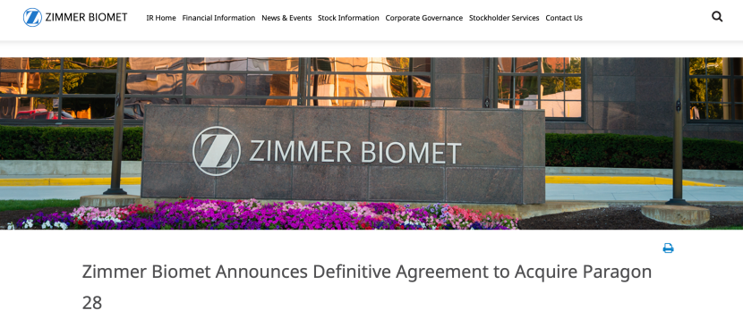 當(dāng)?shù)貢r間1月28日,捷邁邦美宣布,已經(jīng)與Paragon 28,Inc.達(dá)成最終協(xié)議,以每股13.00美元的現(xiàn)金預(yù)付款收購Paragon 28的所有已發(fā)行普通股,相當(dāng)于約11億美元的股權(quán)價值和約12億美元(約合人民幣87億元)的企業(yè)價值。