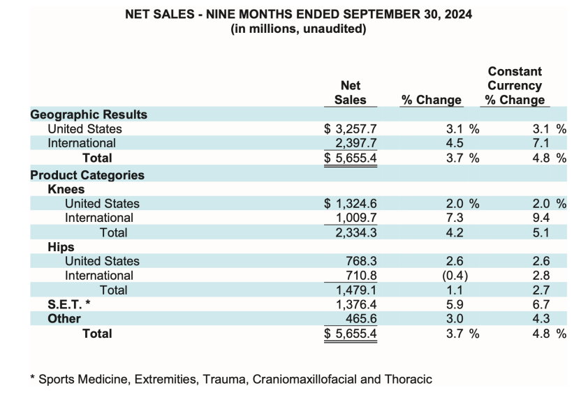 2024前三季度凈銷售額為56.55億美元,增長3.7%。其中,膝部凈銷售額23.34億美元,增長4.2%;髖部凈銷售額14.79億美元,增長1.1%;運(yùn)動醫(yī)學(xué)、四肢、創(chuàng)傷、顱頜面和胸外科凈銷售額13.76億美元,增長5.9%。