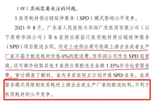 2023年5月底至7月,國(guó)家審計(jì)署對(duì)廣東省藥品和高值醫(yī)用耗材的生產(chǎn)經(jīng)銷使用情況進(jìn)行了專項(xiàng)審計(jì)調(diào)查,發(fā)現(xiàn)醫(yī)用耗材供應(yīng)鏈延伸服務(wù)(SPD)模式影響了公平競(jìng)爭(zhēng),其中廣東省人民醫(yī)院應(yīng)用的商業(yè)集配SPD模式被指出損害了公平性。
