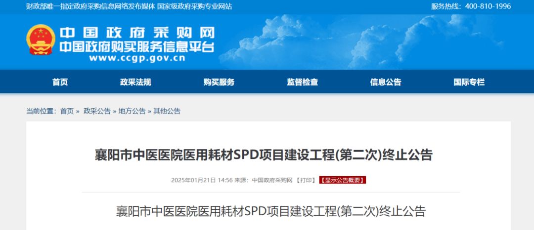 1月21日,中國(guó)政府采購(gòu)網(wǎng)發(fā)布了《襄陽(yáng)市中醫(yī)醫(yī)院醫(yī)用耗材SPD項(xiàng)目建設(shè)工程(第二次)終止公告》,因“遞交響應(yīng)文件的供應(yīng)商不足3家”,項(xiàng)目終止。