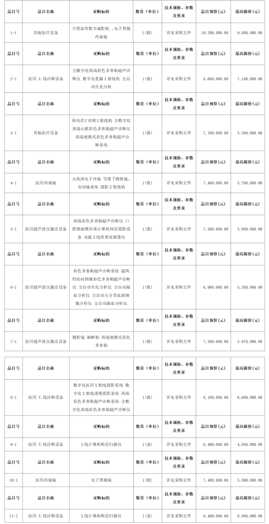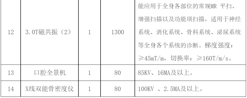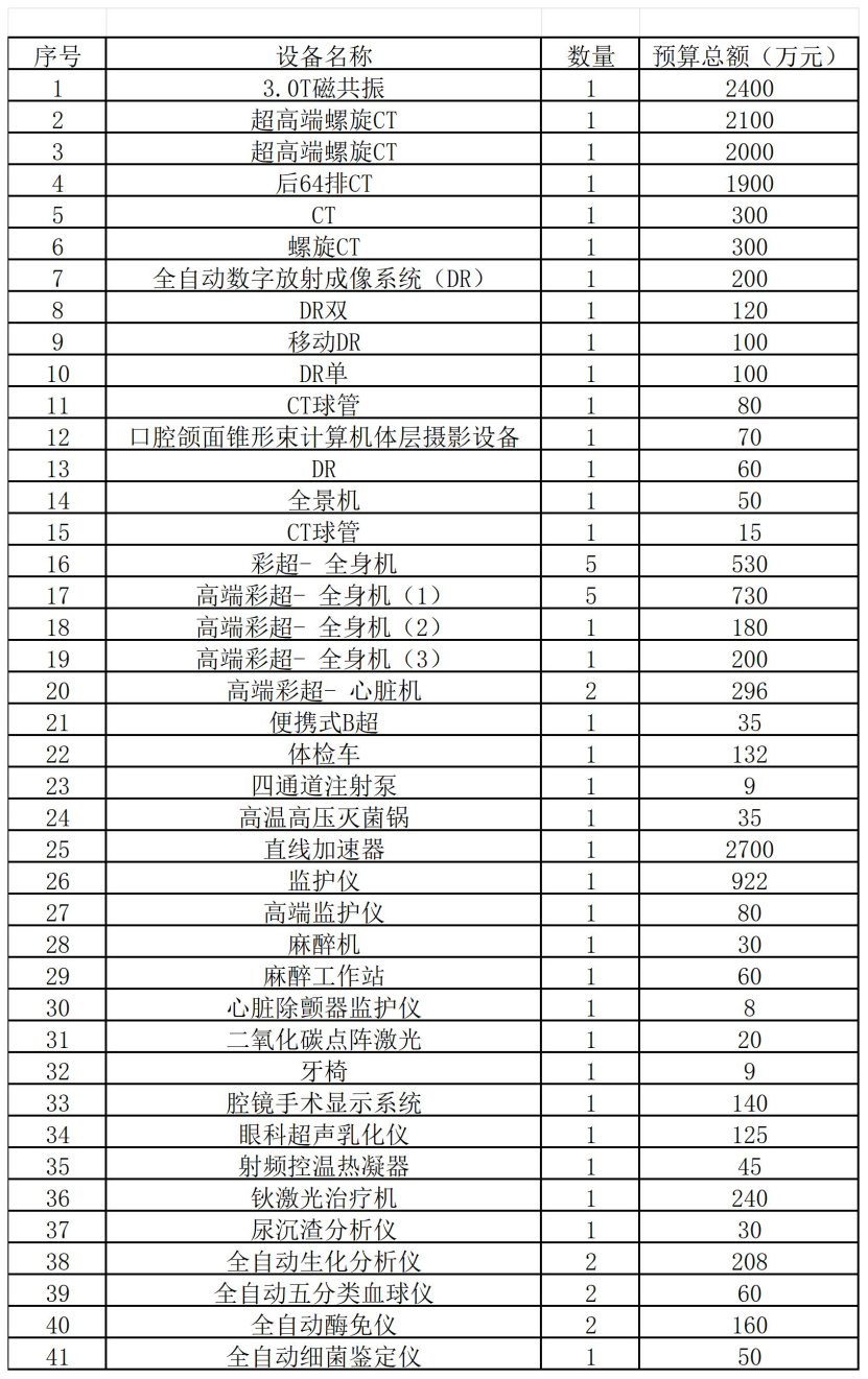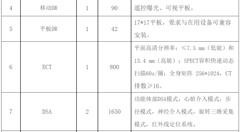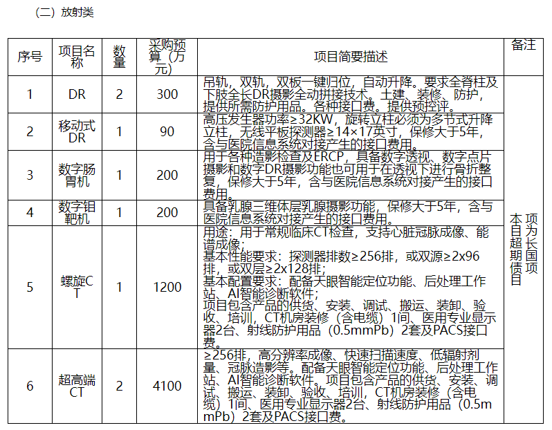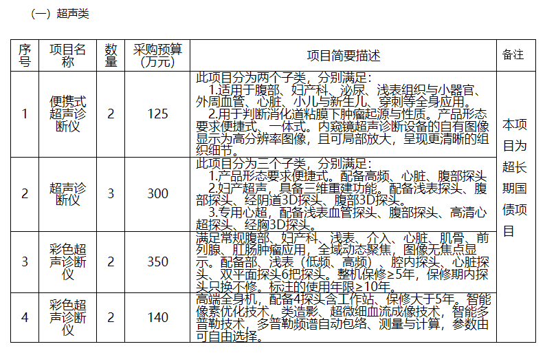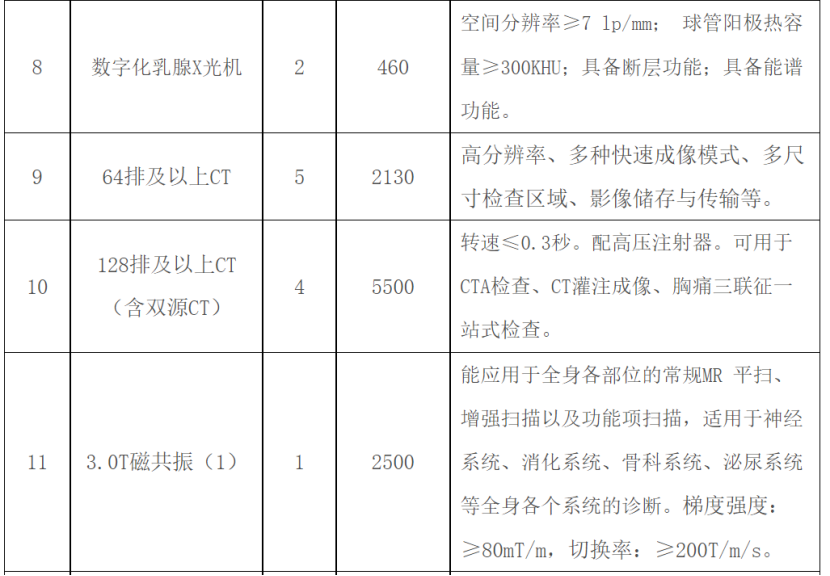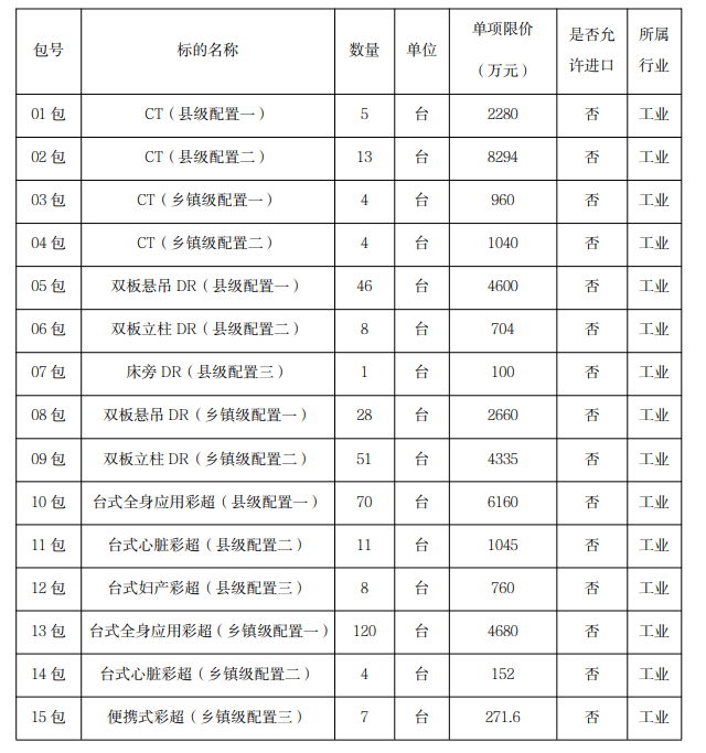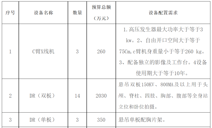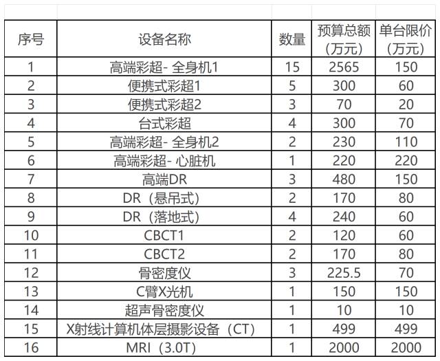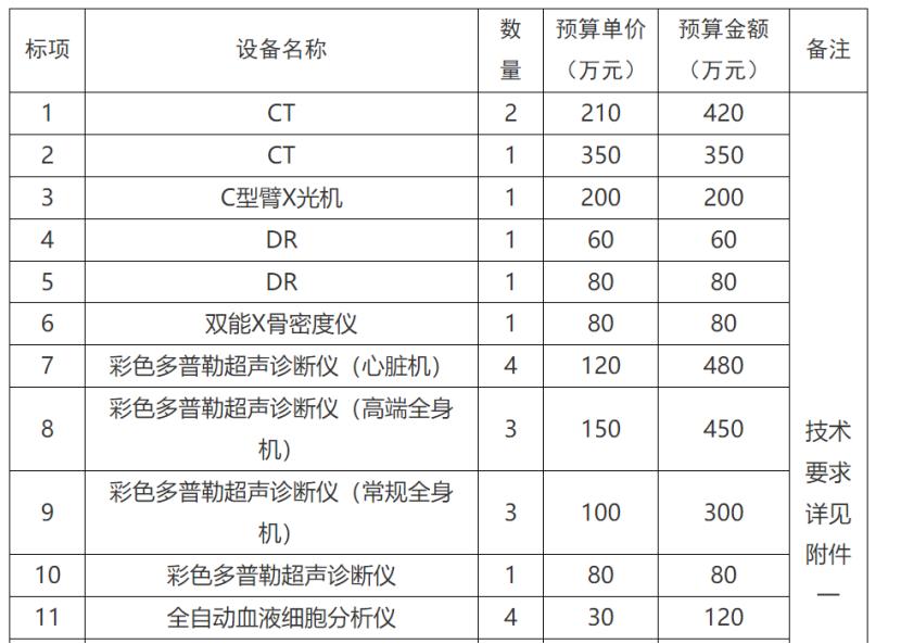 其中,X射線計(jì)算機(jī)斷層攝影設(shè)備(CT)采購需求48臺,預(yù)算金額為3.84億元;數(shù)字化X線攝影系統(tǒng)(DR)采購需求25臺,預(yù)算金額為0.45億元;彩色超聲診斷儀采購需求179臺,預(yù)算金額約2.15億元。