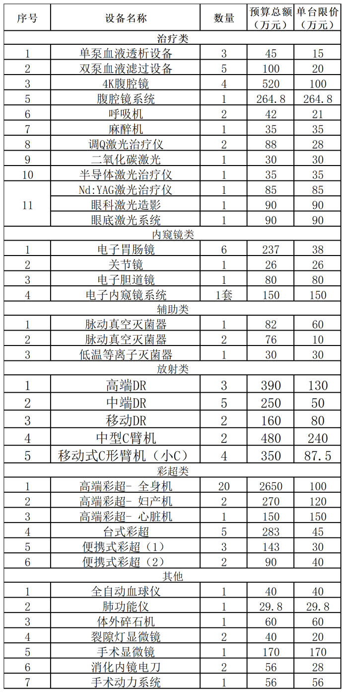 大型血管數(shù)字減影機(jī)、腹腔鏡、腹腔鏡、彩超機(jī)等共39臺設(shè)備(套),用于渭南市縣域醫(yī)共體設(shè)備更新。