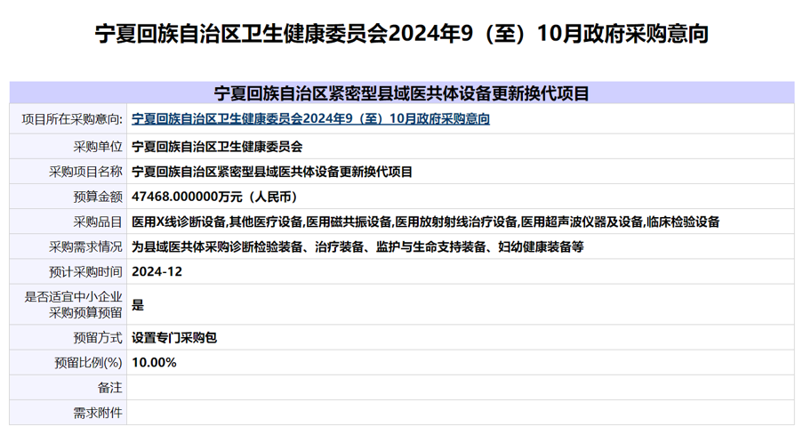 2024 年 9 月 10 日,寧夏回族自治區(qū)衛(wèi)健委發(fā)布了《2024年9(至)10月政府采購意向》,總預(yù)算4.74億元,用于寧夏回族自治區(qū)緊密型縣域醫(yī)共體設(shè)備更新?lián)Q代項(xiàng)目,主要為縣域醫(yī)共體采購診斷檢驗(yàn)裝備、治療裝備、監(jiān)護(hù)與生命支持裝備、婦幼健康裝備等。