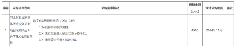 2024年10月26日,河北省衛(wèi)健委發(fā)布《河北省縣域醫(yī)共體醫(yī)療設(shè)備更新項(xiàng)目采購需求調(diào)查征集公告》。其中提出,河北擬批量采購CT機(jī)、DR機(jī)、彩超機(jī)3個品目設(shè)備,并向社會公開征集采購設(shè)備的相關(guān)資料。