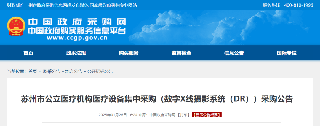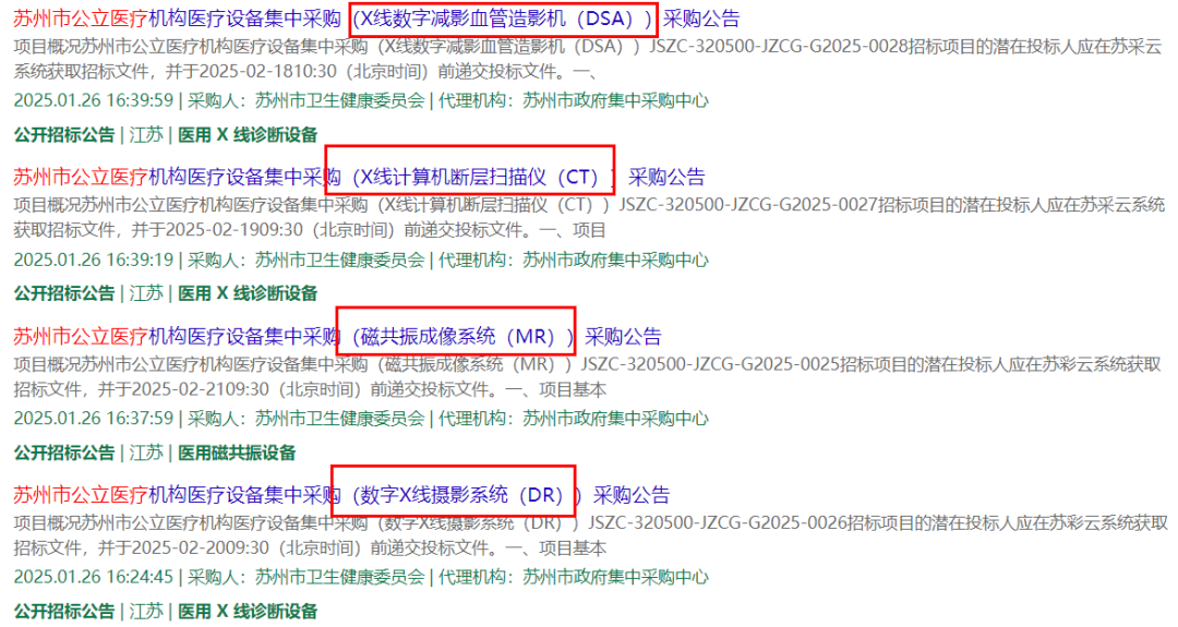 1月26日,中國政府采購網(wǎng)陸續(xù)公布了《蘇州市公立醫(yī)療機構(gòu)醫(yī)療設(shè)備集中采購(DR、MR、CT、DSA)采購公告》。