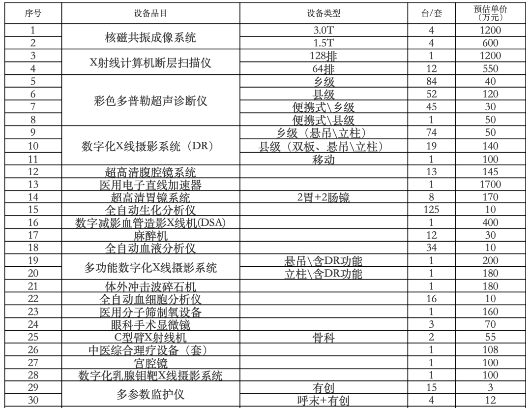 2024年11月,蘇州市衛(wèi)健委正式啟動了《蘇州市2024年公立醫(yī)療機構(gòu)醫(yī)療設(shè)備集中采購(第一批)》,涵蓋了21臺CT、8臺MR、6臺DSA、19臺DR及84臺彩超,總計138臺醫(yī)療設(shè)備,預(yù)算總額高達(dá)4.56億。