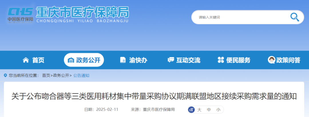 2月11日,重慶市醫(yī)保局發(fā)布《關(guān)于公布吻合器等三類醫(yī)用耗材集中帶量采購協(xié)議期滿聯(lián)盟地區(qū)接續(xù)采購需求量的通知》,公布了各類耗材的采購需求量。