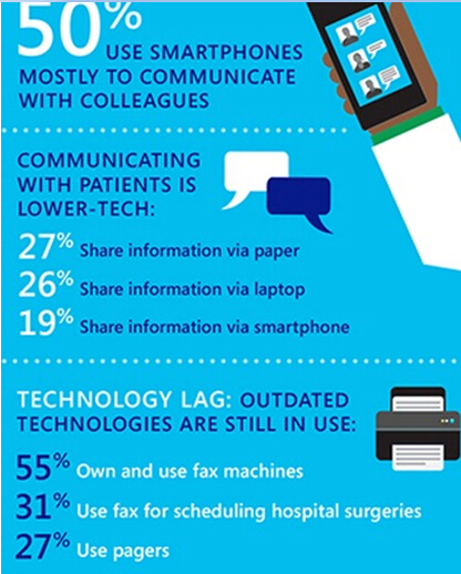 臺(tái)式電腦仍然是美國(guó)醫(yī)生分享很多信息時(shí)的主要選擇:46%的醫(yī)生使用臺(tái)式電腦與同事或?qū)<医涣鳎?0%的醫(yī)生用臺(tái)式電腦安排手術(shù),39%的醫(yī)生用臺(tái)式電腦與藥劑師進(jìn)行溝通,35%的醫(yī)生使用臺(tái)式電腦與病人聯(lián)系。其他醫(yī)患溝通方式包括:紙張(27%)、筆記本電腦(26%)、智能手機(jī)(19%)。50%的醫(yī)生表示,與其他同事溝通,大多使用智能手機(jī)。